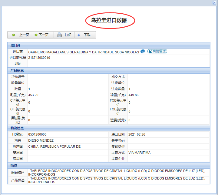 乌拉圭贸易数据是乌拉圭与全球所有贸易公司的每一笔海运交易记录,包含进口数据和出口数据。