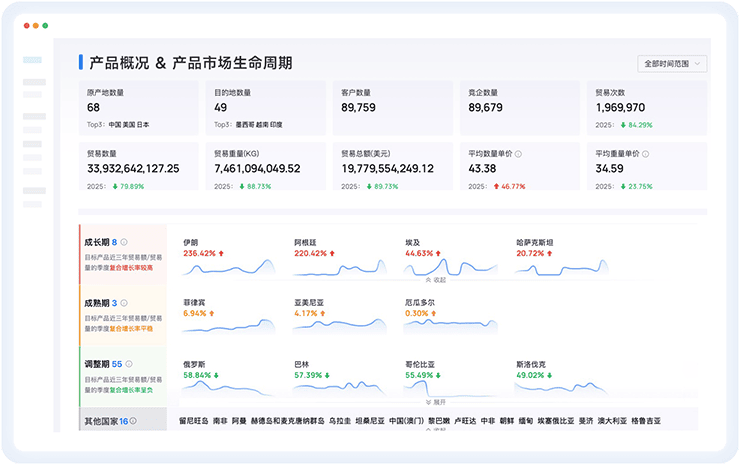 无需手动搜索与分析;一键分析全球贸易趋势、贸易流向、进出口TOP10国家等;定位高价值区域