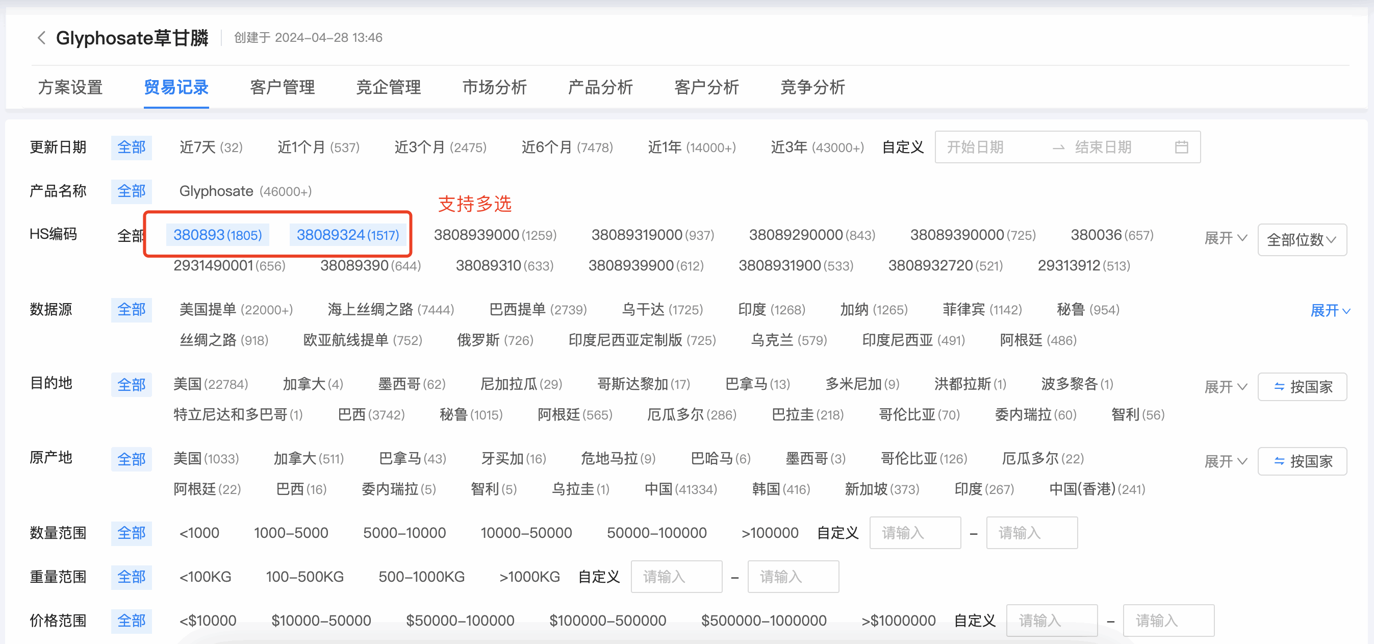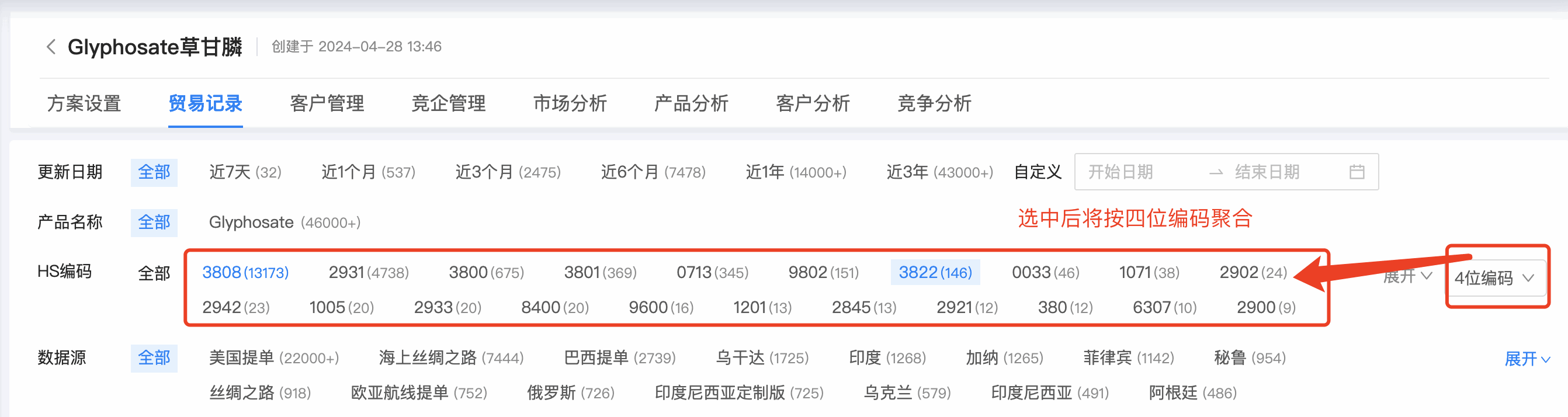 1. SG亚洲胜游数据通贸易记录的编码筛选,支持按 4 位、 6 位编码位数统计,同时可支持多选。