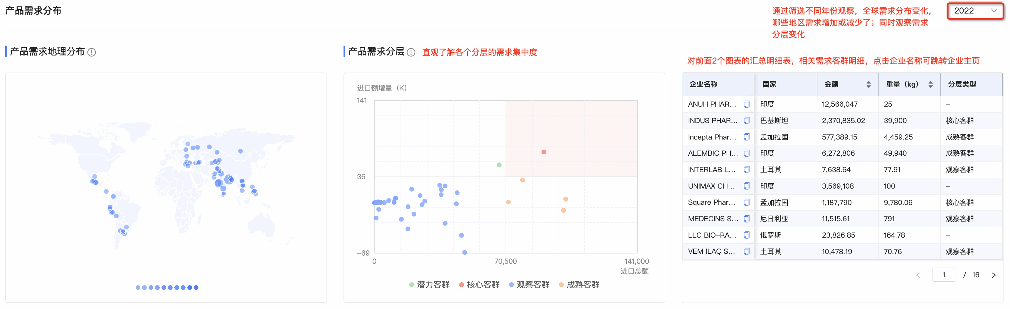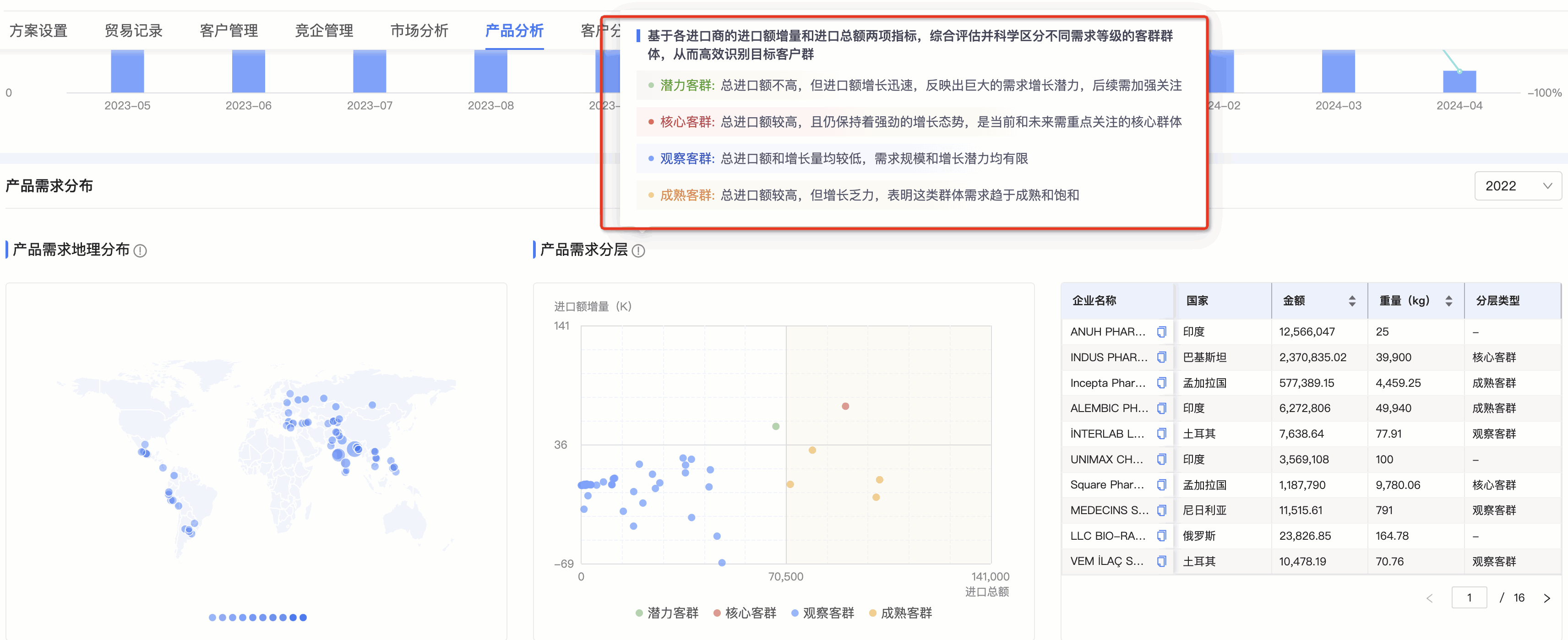 ● 产品需求分层图:SG亚洲胜游数据通将需求客群按照进口额增量和总额进行分层,划分为潜力、观察、成熟和核心四个层级。分层有助于用户快速锁定目标客户群体。标题旁附需求分层的解读,能让用户更直观、快速理解每个层级的特征,能够更快速的识别目标客群。