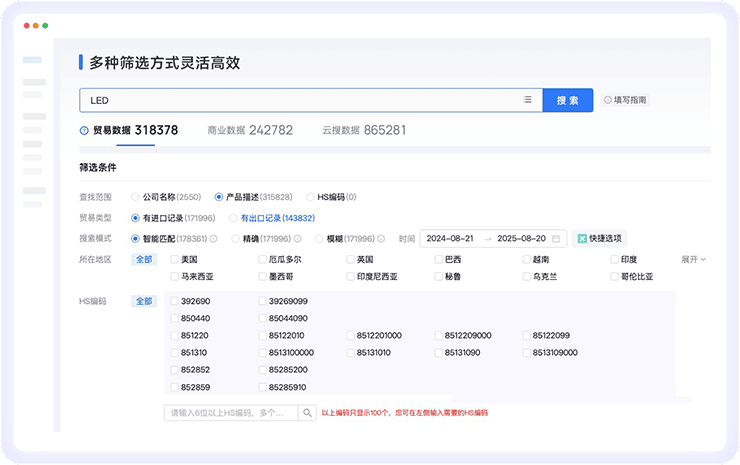 不限制产品、公司名称、HS编码等搜索内容;支持国家地区、HS编码、语言、时间等筛选条件